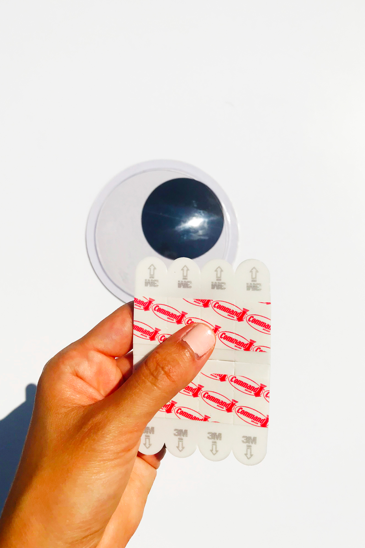 Materials: Large Googly Eyes + Piece of Cardboard or Black Cardstock + Black Plastic Garbage Bag + Scotch Tape + Scissors + Command Strips
